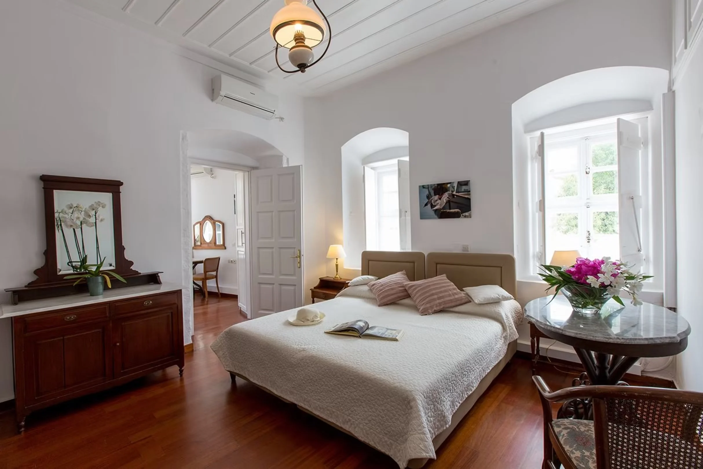 Es gibt Einzel-, Doppel- und Dreibettzimmer. Einige von ihnen haben Meerblick, andere blicken auf den blühenden Garten. Die Zimmer sind mit Antiquitäten aus dem 18. und 19. Jahrhundert eingerichtet. In den Räumen im zweiten Stock sind die Decken von italienischen Malern aus der Zeit des Baus des Herrenhauses im Jahr 1810 bemalt und bis heute intakt geblieben.
