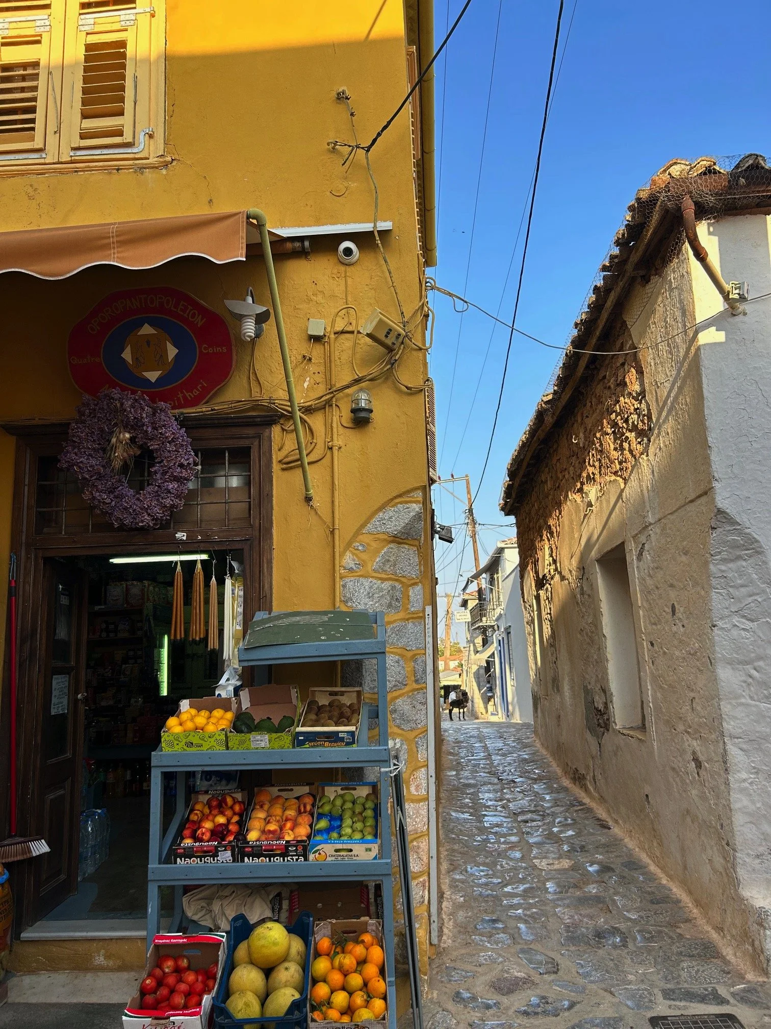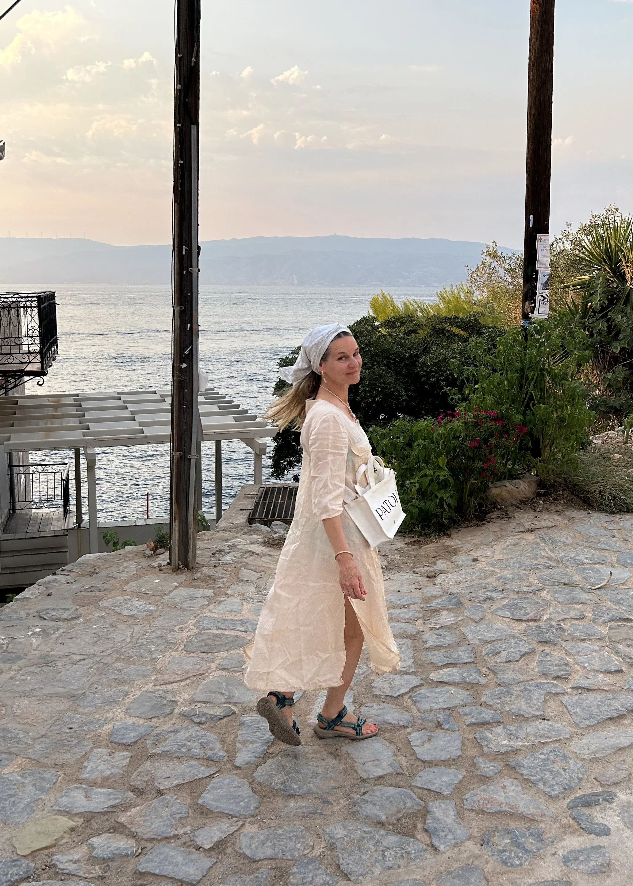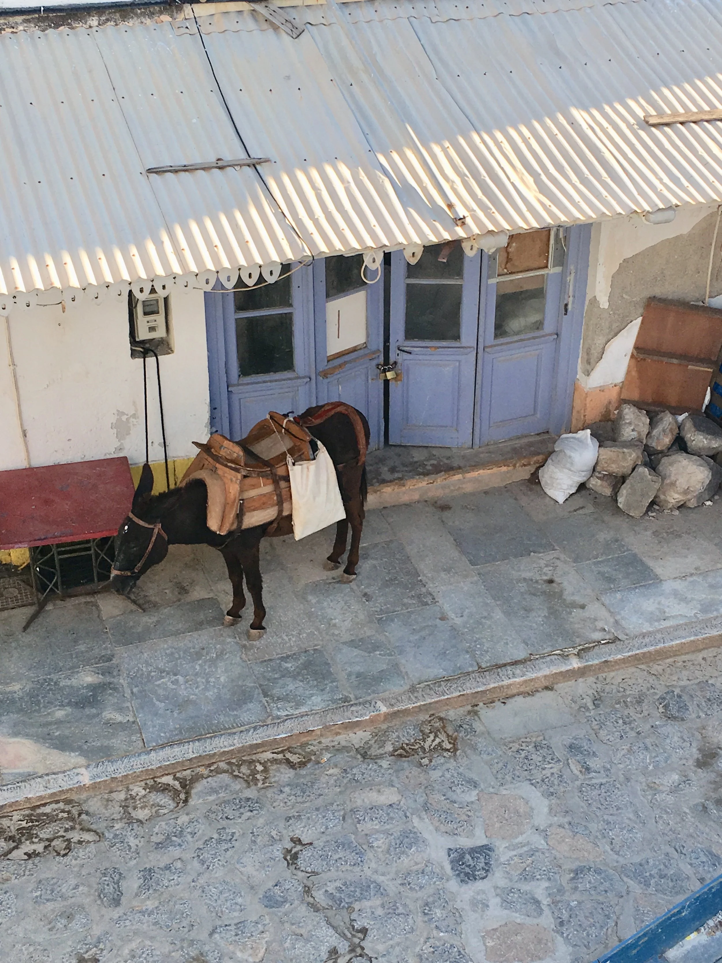 Schon von Ferne, übers Wasser kommend, die goldene Sonne sich drehen sehen, als sei kein Augenblick vergangen. Vom Schiff springen, rein in diesen fünfziger Jahre Hafen, mit dem Köfferchen vorbei an den Promenaden Cafés und den bepackten Eseln. Den Booten γεια zurufen, da seid ihr ja! Die Beine aufs warme Geländer am Spilia legen, zuschauen, wie die anderen von den Klippen springen, von denen schon Leonard Cohen ins Meer sprang. Mit der Morgensonne im Gesicht und dem zweiten Café Fredo in der Hand seelenruhig Charmian Clift lesen. Mit dem Bötchen zum Bisti Beach tuckern, schnorcheln, zwischen Pinien auf der Liege Wassermelone essen. Unter dem Orangenbaum im Garten vom Hotel Miranda sitzen und an Henry Miller denken. Einatmen und ausatmen, einatmen und ausatmen, auf und abseits der Matte. Sich morgens um acht so lang machen wie die Katzen auf den warmen Mauern. Bei Douskos an einem pickepackevollen Tisch sitzen, sich das Wasser im Mund zusammenlaufen lassen. Sich in den Klang der eigenen Schlappen auf den rutschigen Marmorgassen verknallen. In das Licht, bevor es hell wird und in das Licht, nachdem es dunkel wird. Spanakopita zum Frühstück und Gigantes zum Abendessen, oder andersrum. Oben beim Four Corners Supermarket Bienenwachskerzen kaufen und sich für eine Sekunde wie die junge Marianne fühlen. Auf dem Rückweg bei Rafalia dem launischen Apotheker einen Besuch abstatten, an jedem einzelnen seiner hausgemachten Parfums riechen und vielleicht kein einziges kaufen. Mit salzigen Haaren eine Kugel salted caramel bei En Plo essen, auf die Yachten glotzen und mit niemandem tauschen wollen. Bekloppt glücklich an der Windmühle vorbei bis nach Kamini laufen, um die Sonne bei Kodylenia's noch zu erwischen, bevor sie ins abgrundtiefe Meer fällt.